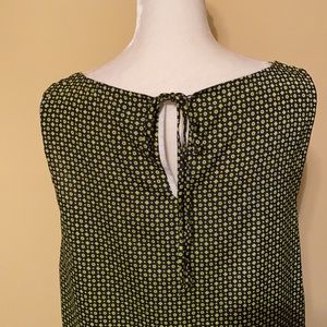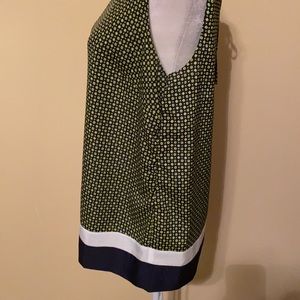 Ladies medium LOFT blouse, lightweight polyester, black/navy, lime green, and white, tie at the top of the peep hole in back at the base of the neck