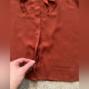 Rusty color. Buttons all the way down, but button are hidden. Ruffles