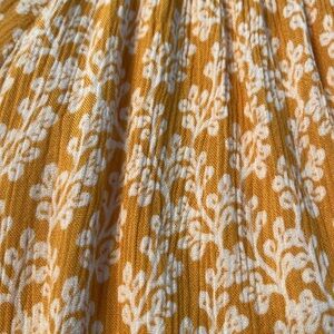 LOFT yellow gold and white print top, size XS, but very large, more like a generous ladies M. Machine wash, smocking at neck and sleeves; loose, flowy, comfortable. From a pet free, smoke free home. 25 in shoulder to hem, 22 in across pit to pit.