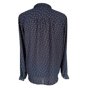 Women's LOFT blue and white polka dot long sleeve button down blouse, size XS. This is sheer with a band collar and button sleeves. Machine washable. 100% Polyester. Made in India. Excellent like new condition and from a smoke free pet free home. Quick shipper!