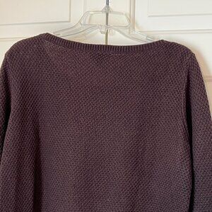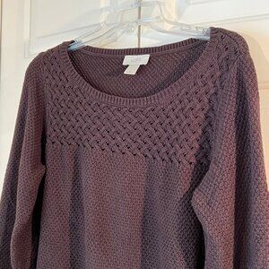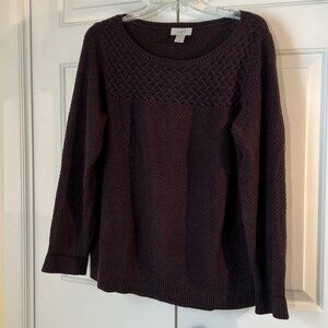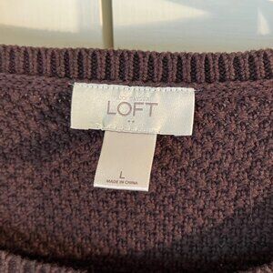 LOFT brand crewneck sweater, brown, size Large; Mixed stitch, basket weave detailing across the chest, neckline; Wider jewel neck, crewneck; Back length from neck to hem = 24 1/2"; Width at chest = 21"; Pre-worn, very good condition.
