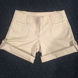 These are great shorts!! Long Bermuda length can be converted to shorter shorts with a quick roll and button!! Cute stitching detail on pockets and belt loops. Back flap pockets button closed. Waistband flat 17”. Rise 9”. Full length 9.5”, rolled and buttoned approximately 6”.