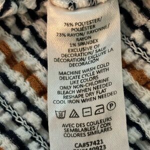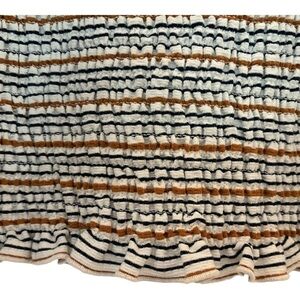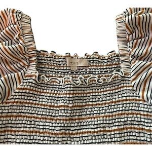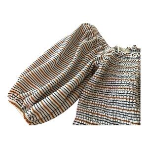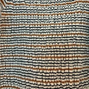 Summer staple! This cute and flirty crop top has a square neckline framed by a delicate ruffle. The body is ruched all around also with a delicate ruffle at the hem. The best thing is these wonderful sleeves. They’re 3/4 length and very full with elastic. Gold, cream and black stripes.