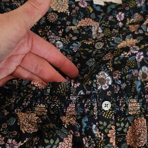 This LOFT blouse features a dark, moody floral print with soft peach, blush, and muted blue tones on a black background. The design is elevated with delicate pintuck pleating across the chest, subtle gathering for a flowy drape, and raw-edge ruffle trim that adds texture without looking fussy. Button-front style with a relaxed, swingy silhouette thats forgiving and easy to wear.
