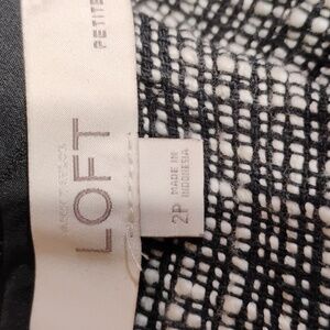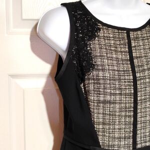 This is an adorable dress made by LOFT made of cotton and polyester. black on sides with black and white center. sleeveless lace on top shoulder areas.. long silver zipper up the back with long black pull tabs. nice stitch work. size 2 petite