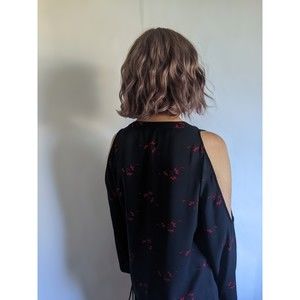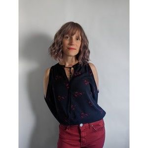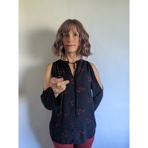 LOFT floral print cold shoulder. Long sleeve tie neck blouse, Navy & Red. sz M