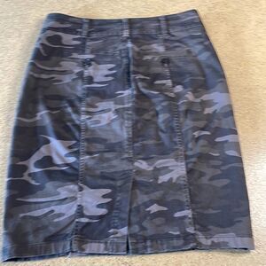 LOFT gray black camouflage print pencil skirt. Features nice cotton spandex blend for comfort, allover camouflage print, squared off front pockets, back hem slit, zip and double button closure. This appears new without tags and has no flaws to note. See pics for measurements.