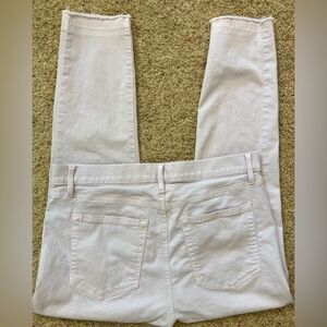 Lovely lavender jeans w/ cool raw or fringed hem. Great pockets. High waist, belt loops, zip fly. Never worn no flaws. Dress up or down. Hard color to find. Has stretch. Waist is 17” flat rise is 11.5” inseam is 27”. Top to bottom 36”. Wear a/ black or another bright, pastel or neutral. LOVE these!
