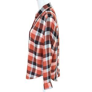 Colors are orange, black , white and blue. 100% viscose. Chest pocket, shirttail bottom hem. Approximate measurements are pit to pit 20”, length from shoulder approximately 24-28”, longer in back.