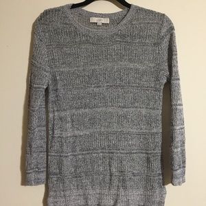 LOFT light, crocheted sweater in blue/white. Looks gray with the mix of colors. Perfect for Fall. Small slit on sides. Good condition.