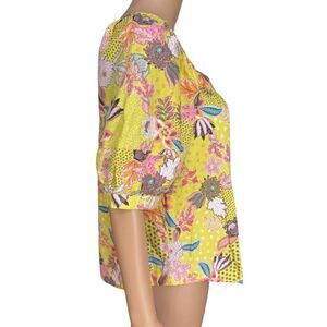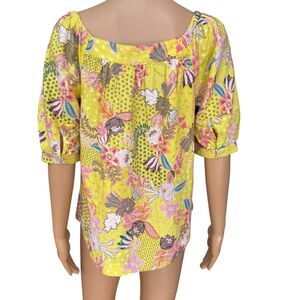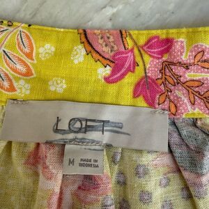 LOFT linen blend Yellow Floral Peasant Colorful Abstract blouse puff sleeves M