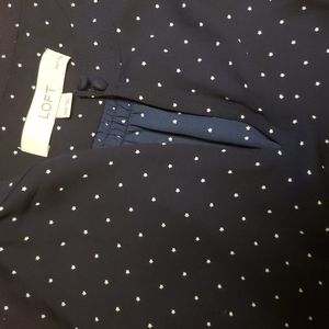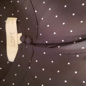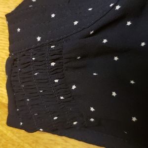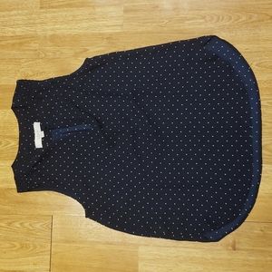 Excellent pre-owned condition Navy sleeveless top with white micro star print. Two buttons at neck with keyhole opening. Smocking on the shoulder. 17.5 in pit to pit. 23 in shoulder to hem.