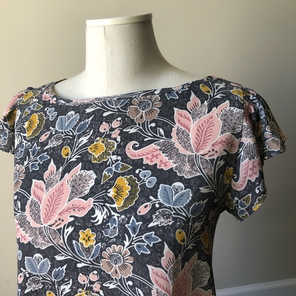 LOFT top with floral and paisley designs and cap sleeves.