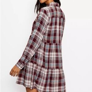 LOFT plaid long sleeve dress. It hits at the knee area. It has a collared neck & button front with a pocket.It is tiered also. New with tags,never worn.