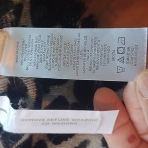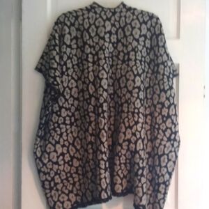 Welcome the cold in this cozy poncho/open wrap-style sweater. Oversized and sleeveless, perfect for layering, with fringe trim at the hem. Made of a polyester/viscose/nylon blend, it has plenty of "fuzzies" that are typical of this fabric; see photos.