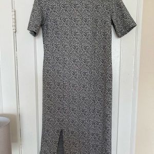 Perfect for the office or pack for a conference. very generous, stretchy material would fit an 8 generously to. Very comfortable dress but looks very put together -for sitting in meetings. A type of jersey material.
