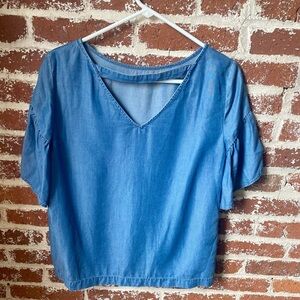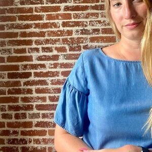 business casual, professional, office, preppy, ruffles, denim, open back detail, spring, summer, fall