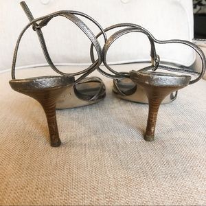 GUC leather embossed sandals with ankle buckle. Minor signs of wear (see photos) - lots of life left! Stacked wooden 3” heel. *also selling in tan and black separately in my closet! This listing is for 1 pair only*