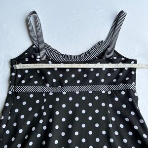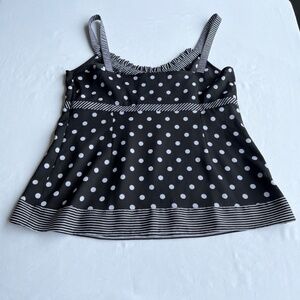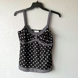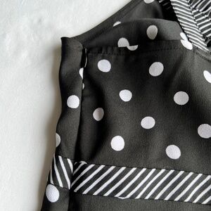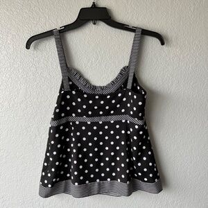 LOFT size 10P black with white polka dots sleeveless top. Empire waist style with flowing bottom, side zipper. Contrasting strip banding. Great preowned condition.