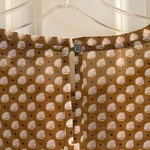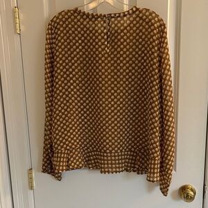 LOFT size LP mustard/cream patterned top with a ruffle peplum hem. Features round neckline with back button closure and long sleeves with pleated button closure. 100% polyester. Ideal for versatile styling.