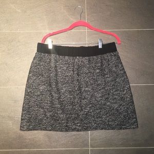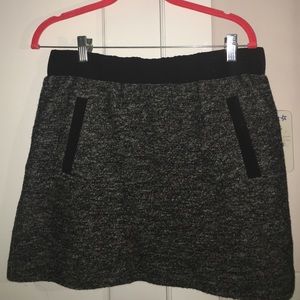 Charcoal grey/black skirt with front pockets. Tweed-esque material (but not too heavy and it's really soft). Looks great with tights and boots. I've worn it twice.