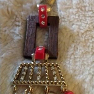 LOFT gold flat chain, pieces of wood, rhinestones, orange and clear beads