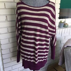 Maroon and tan striped sweater. Wide sleeves, longer in the torso. Great with leggings and boots and in great condition.