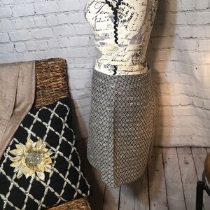 Thick tapestry fabric pretty teal/white print. Back zipper. Gently preowned condition
