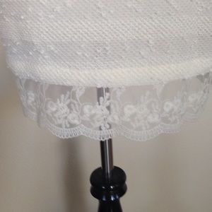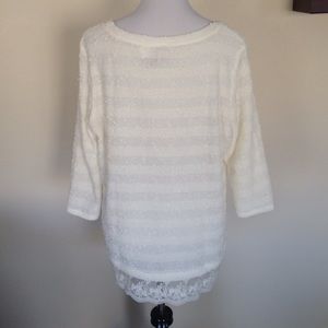 This ivory top has a light stripe woven into the fabric with cute lace detailing on the bottom. Only worn twice. No stains. Great condition.