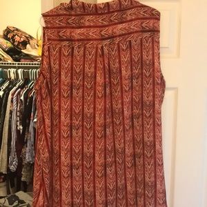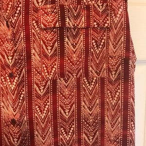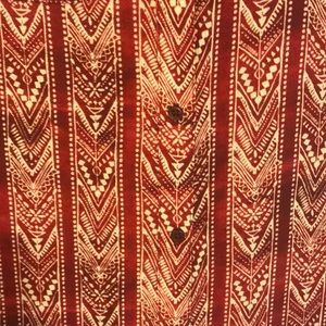 Red blouse/tank with collar, buttons down the front and pockets on both sides, cream tribal pattern