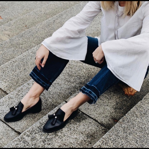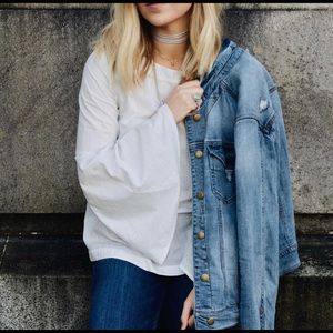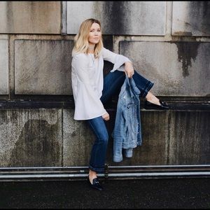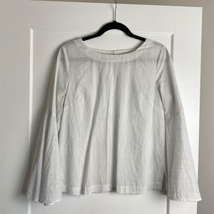 White top with small black pinstripes. Sleeves are flared. Lightweight 100% cotton.