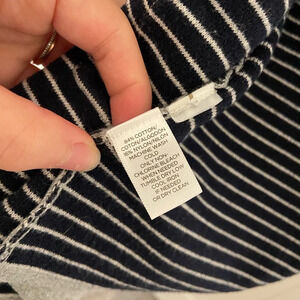 Women’s LOFT cardigan sweater. Sweater is gray soft knit material with a navy blue & white striped interior. Has open front design with front pockets. Looks like it’s missing a belt, but can definitely be worn without it! Size XS. Smoke free home!