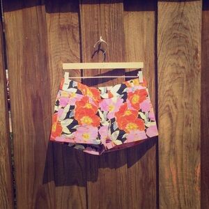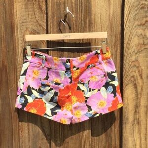 Tropical floral print shorts, back welt pockets, 100% cotton. Pink, purple, blue, yellow, orange, black multicolor. Great condition. No rips stains pills or odors.