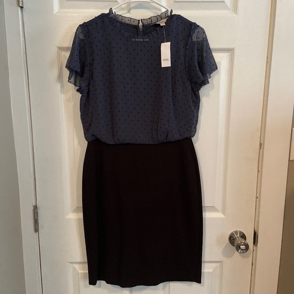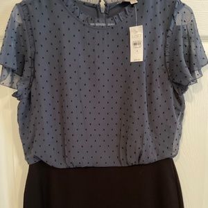 LOFT size 4 women’s dress, grey blue blouse top with a black skirt. Black dotted pattern overlying the blouse portion. Never been worn, tag attached. Zips in the back.