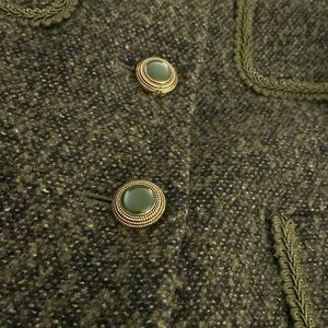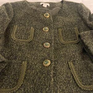 This LOFT blazer features a chic collarless design in a textured tweed fabric, offering a stylish blend of casual and semi-dressy appeal. Gold and green detailed buttons, cropped length and boxy cut make it a versatile addition to any wardrobe, perfect for adding a touch of vintage-inspired elegance to your look.