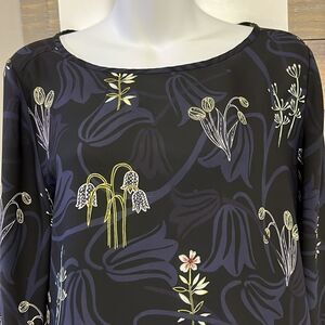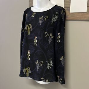 LOFT Black and Navy CrewNeck Floral Long Sleeve Blouse with Side Slits- Medium