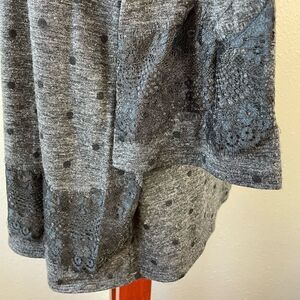 Stylish top featuring a cold shoulder design and black lace trim. It measures 19 inches armpit to armpit laying flat and 28 inches in length from shoulder to hem.