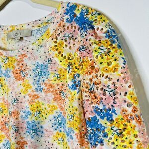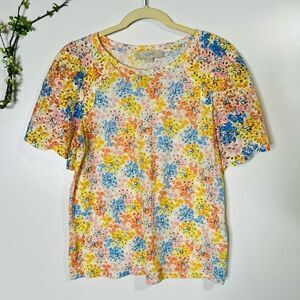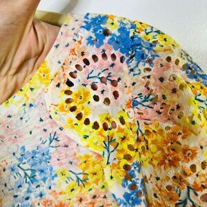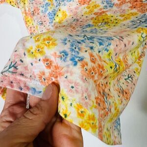 Blue, orange, yellow, pink flowers with flowy embroidered lace sleeves