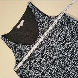 Silky scoop-neck tank top by LOFT has a mini floral print of blue and black with a sheer solid black lining. The split tail hem is curved. Perfect alone or layered. Wear a classy & beautiful piece instead of a plain tank! In awesome, like new condition.