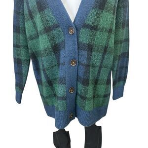 LOFT Green Blue Black Plaid Boyfriend Cardigan Oversized Sz XS Academia