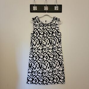 Linen sleeveless dress with Ikat print and ruffled detail at collar. Lined.