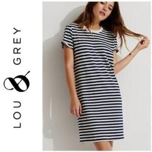 LOFT Lou & Grey Striped T Shirt Dress. Navy and Cream Stripes. Cream Crew Neck Collar. Short Sleeves. Lightweight and super comfortable! Excellent Used Condition - like new. Size XS. 53% Linen, 22% Rayon, 22% Cotton, 3% Spandex.