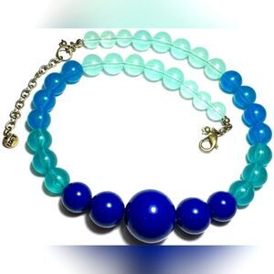 This vintage jewelry necklace is a vibrant and stylish piece designed with graduated beads in varying shades of blue, ranging from a deep cobalt to a pale arctic tone. The chunky beads are crafted from what appears to be a glossy material, arranged in a striking pattern that emphasizes the larger beads at the center and transitions to smaller beads towards the clasp. The necklace features a gold-toned chain extender, adorned with a small "LOFT" charm, indicating the signature brand. The lobster clasp closure ensures security and adjustable wear, with a total length ranging from 18.5 to 20.5 inches. Perfect for adding a bold and sophisticated accent to any outfit.