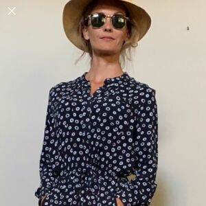 Cute versatile dress or tunic in navy with white donut hole print. Two chest pockets and two more on the hips. Drawstring tie waist and adjustable sleeve length. Skirt part is lined. Good condition