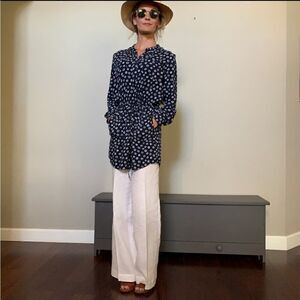 Cute versatile dress or tunic in navy with white donut hole print. Two chest pockets and two more on the hips. Drawstring tie waist and adjustable sleeve length. Skirt part is lined. Good condition