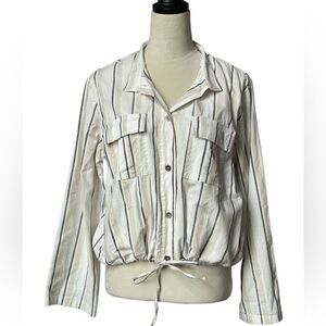 This brand new top/lightweight jacket has a combination of materials that feel very linen like. Neutral colors, white, blue & cream stripes. Button down with collar and pull tie on the bottom. Perfect for the office, school, professional wear, or just a casual top for everyday.