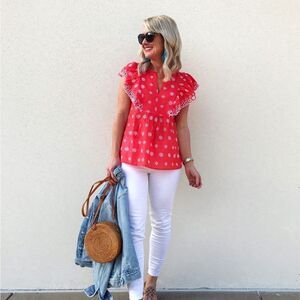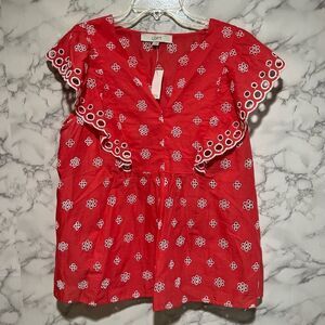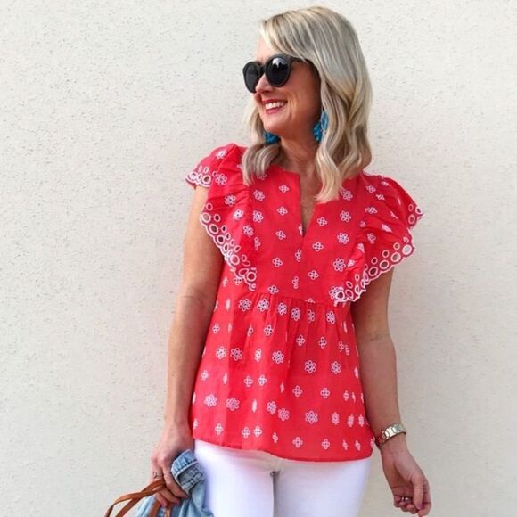 In a juicy hue, flared flutter sleeves play up the flirty factor of this eyelet-detailed cotton shell - a total taste of paradise. Split neck.