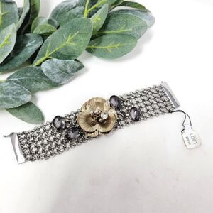 Beautiful silver tone chain mesh bracelet with a gold tone flower accent with rhinestones. It has a magnetic closure, with a fold over lock clasp protection as well. It is approximately 7.5" long. It is new with tags. Please see all photos as this is the exact item you will receive. Thank you so much for looking. I am always open to reasonable offers. Have a fantastic day!