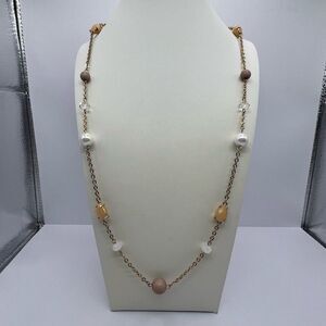 LOFT Station Beaded Bib Necklace Chain Gold Tone Pinks Cream Classic Statement