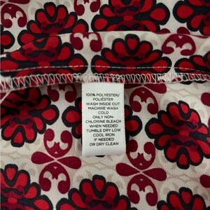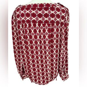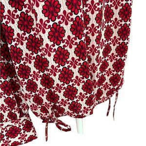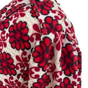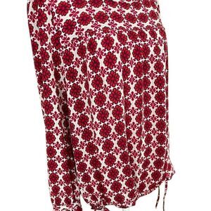 Round neckline with button tabs at shoulders. Long sleeves with button cuffs, drawstring bottom with ties on each side. Colors are tan/ivory background with black and red floral design. 100% polyester. Approximate measurements are pit to pit 20”, length from shoulder approximately 25”.